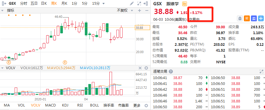 华盛资讯6月3日美股盘初,跟谁学(GSX)开盘后持续走强,截至北京时间22:00,该股涨幅扩大至5.17%,报38.88美元,总市值为92.82亿美元。