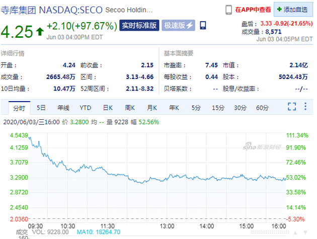 新浪科技讯 北京时间6月4日凌晨消息,周三收盘,寺库(NASQ: SECO)股价暴涨97.67%,报收4.25美元,市值2.14亿美元。不过在截止北京时间4:05的盘后交易中,股价大跌21.65%。