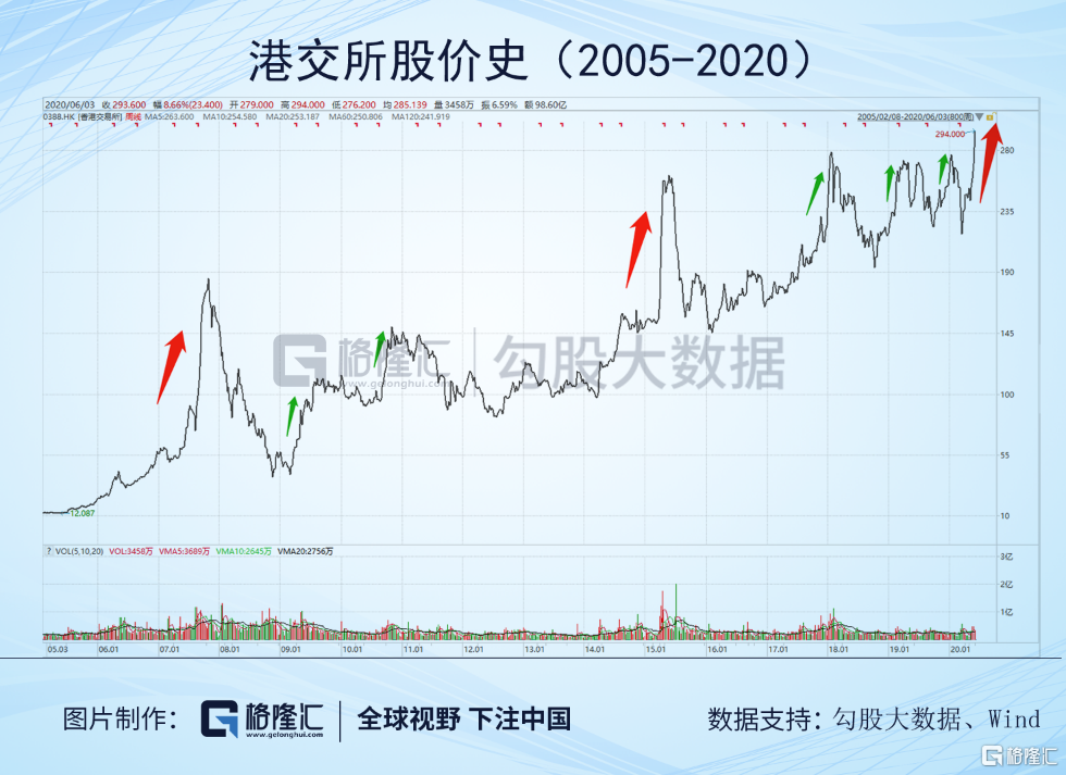 在历史上,这三条逻辑反复出现,影响港交所的股价变动。请看下图。