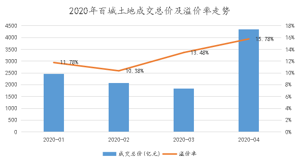 在月度成交总价和溢价率上,4月成交总价4336亿元,环比增加136.79%;平均溢价率15.78%,为今年4个月内最高。