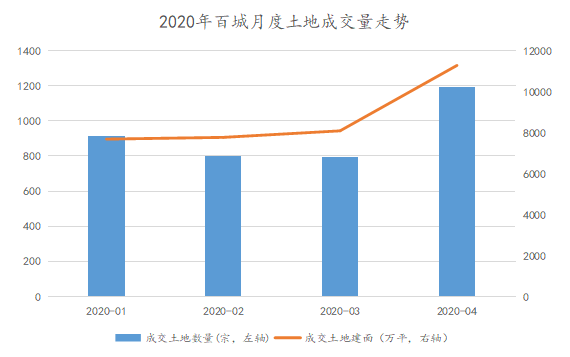 据wind监测的100个重点城市数据显示,4月百城成交土地数量1193宗,成交土地建面11283万平方米,较3月有明显提升。