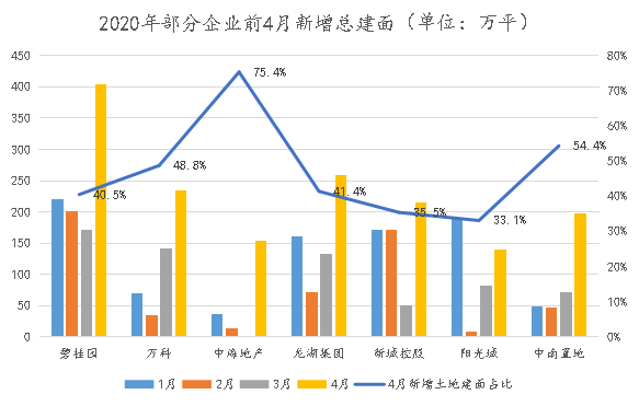 例如万科4月新增10个土地项目,新增土地建筑面积404.4万平方米,单月新增建面占前4月新增建面总和的48.8%;其他房企如中海、碧桂园、龙湖等在4月的拿地节奏也明显加快,甚至连鲜少拿地的富力地产4月也分别在兰州、太原拿下4宗地块,新增土地建面123.8万平方米。