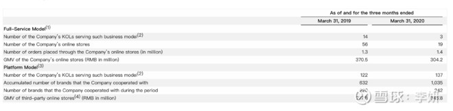 公司正在经历业务转型,重点拓展第三方平台服务。自营模式下的网红数量已经从2019年3月31日的14位减少至于2020年3月31日的3位;店铺数量由56个减少至19个。平台模式下的网红数量由2019年3月31日的122位增加到2020年3月31日的137位,同比增长了12%;平台业务模式下服务的品牌数自去年的632个上升到2020财年的1035个。由此带来平台业务高增长,自营业务调整的经营结果。