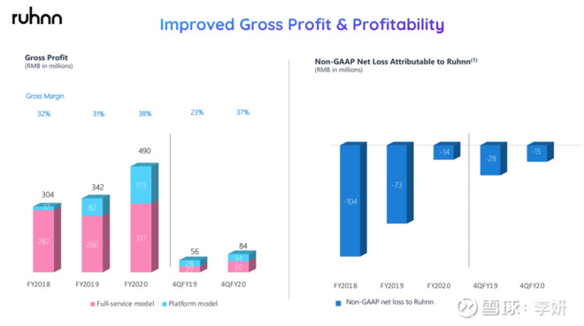 财报中显示,自营业务在2020财年实现产品销售收入为9.926亿元,较去年同期的9.428亿元增长了5%,保持着以往的稳健发展势头。第三方网店GMV 由上年同期的2.78亿元,增至四季度的3.46亿元,并带动公司服务业务成为公司营收的主要增长来源。2020财年如涵服务收入同比大增101%至人民币3.032亿元(4,280万美金);第四财季服务业务收入为人民币6,220万元(880万美金),较去年同期增长24%。