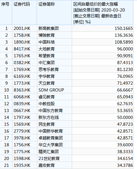 其中新高教集团从3月20日至今2个多月时间实现最大涨幅甚至达到150%。
