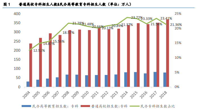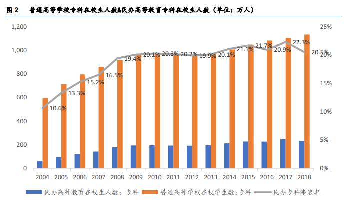据统计截至2018年底,中国有1400 多所高职(专科)院校,其中民办高职院校300余所。截至2018年底,普通高等教育专科在校生人数1133.7万人,其中民办高等教育专科在校生人数232.5万人,民办专科渗透率20.5%。