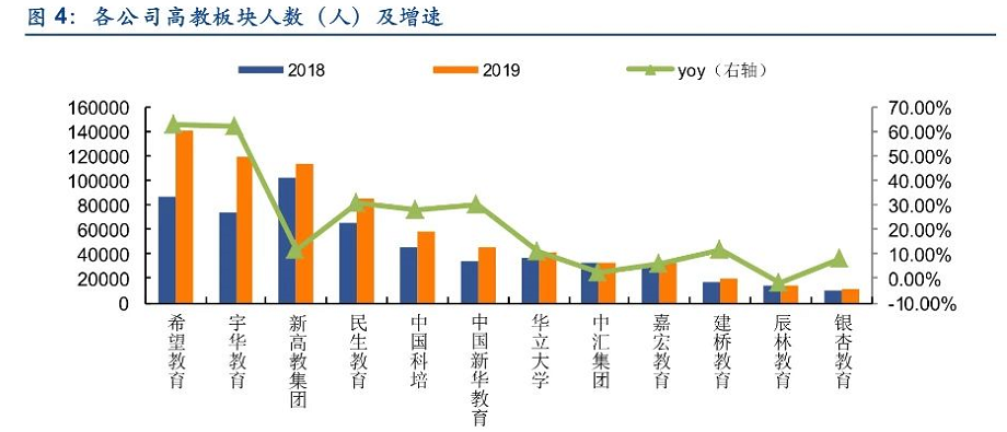 而希望教育在2019-2020学年14所学校总人数达14.01万人,同比增长63%,如果剔除新并入财报的贵州大学科技学院、鹤壁学院、苏州托普学院、银川能源学院的3.6万人,10所学校在校人数为10.42万人,同比增长21%。