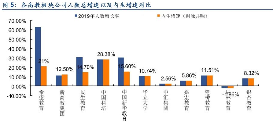 如果从内生增长速度对比,中国科培、希望教育以28.38%和21%的增速位居民办高教板块前列。民办高教公司的在校学生人数内生增长普遍在10%左右,由于学额和学区扩建存在一定差异。