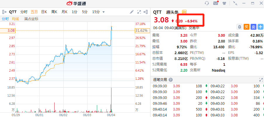 华盛资讯6月4日讯,受财报强劲拉动,趣头条(QTT)盘初股价大涨7%,截至北京时间21:41,该股涨幅6.94%,报3.08美元,总市值为8.218亿美元。