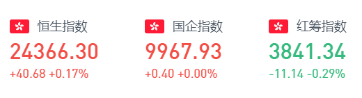 恒生指数周四高开后,早盘单边下跌,随后维持窄幅震荡走势。截至收盘,恒生指数涨40.68点或0.17%,报24366.3点,全日成交额达1178.85亿。国企指数平收,报9967.93点,红筹指数跌0.29%,报3841.34点。