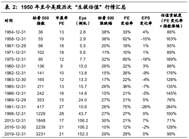 历史悠久的美股市场中也经常会发生这种“生拔估值”行情。根据统计,1950年至今,美股市场一共有 16 年可以称得上是“生拔估值”行情(定义为当年标普 500 指数上涨幅度超过 10%,且估值贡献度(PE 变化率÷指数涨幅)大于 70%)。