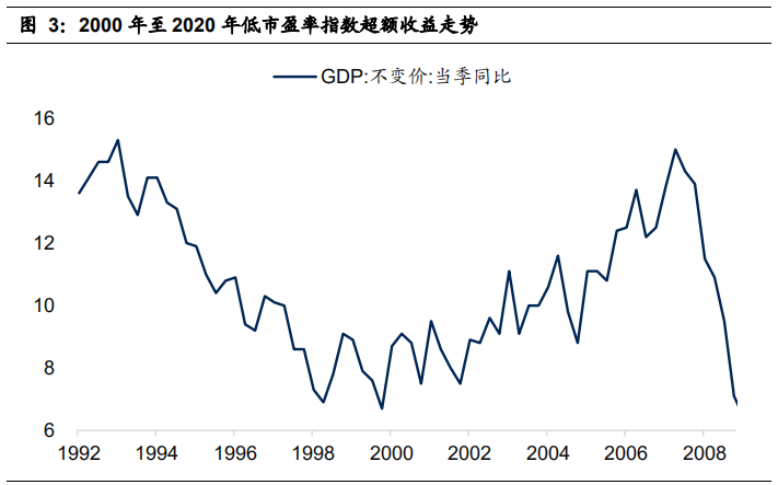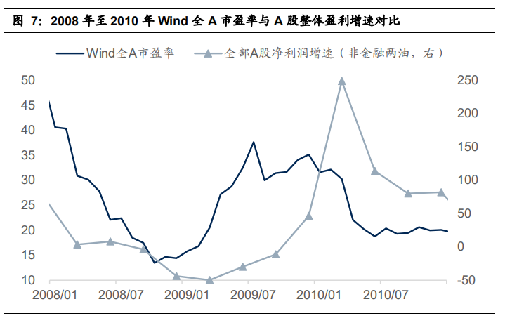 2009 年 Wind 全 A 指数的市盈率明显领先于全部 A 股的净利润增速。这充分说明了股价的领先性,因为在当时的情况下,2008 年底“四万亿投资计划”的公布叠加 2009 年初“天量信贷”,使得市场对于经济复苏形成了充分的一致预期,使得市场表现遥遥领先。
