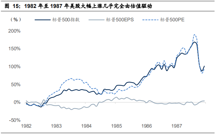 80 年代的美股牛市大致可以分为两个阶段,1987 年股灾前牛市靠估值驱动,之后靠基本面业绩驱动,中间的转换就是1987 年 10 月的股灾。
