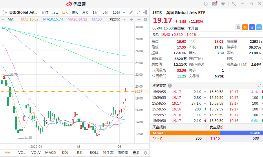 在仅仅3个月内,美国的一支航空主题ETFGlobal Jets(JETS)基金实现了规模暴增超3000%该ETF已经从5月14日11.27美金的低点反弹了70%。