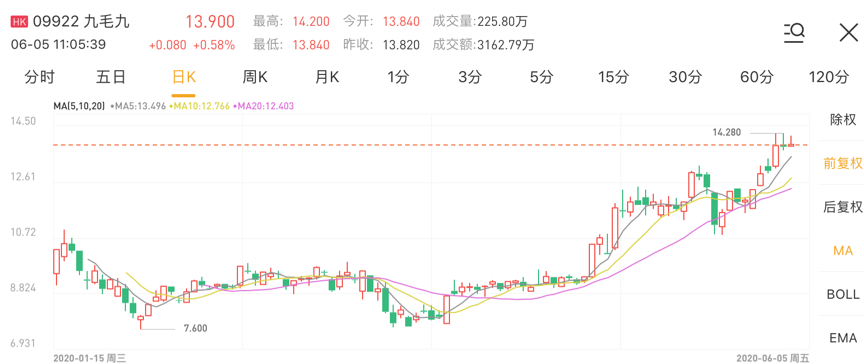 九毛九作为近期上市的当红热门餐饮股,在经历疫情后,反而上涨势头更猛。以疫情期间触及的最低价7.6港元计算,当前股价已经大涨超85%,而其中耗时不足5月。