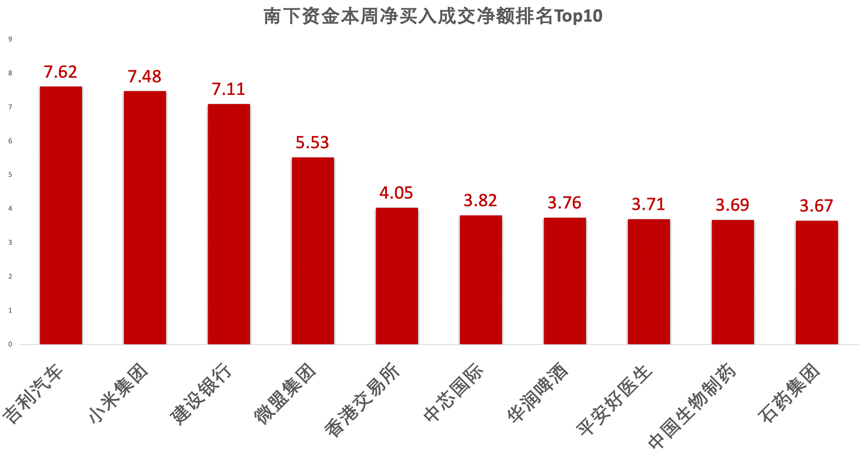 本周,南下资金青睐吉利汽车、小米和建行,三者均获北水净买入超7亿港元。此外,微盟集团、香港交易所亦是资金买入重点。整体来看,本周北水买入的单支个股成交额大幅下滑,上周排名第一的建行获资金净买入成交额净超过20亿港元,而本周吉利汽车不足8亿港元。