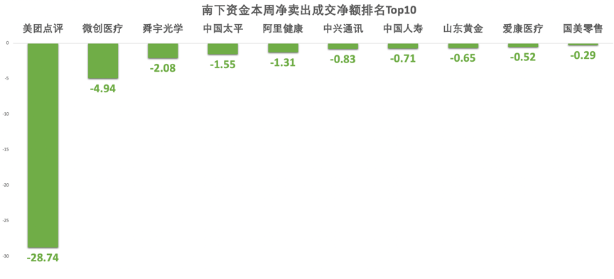 南下资金净卖出额排名Top10中,本周涨势如虹的美团点评遭到北水大额卖出,成交净额高达28.74亿港元,金额之大实属罕见,同时亦反映出北水对大涨的热门个股更倾向于减仓。