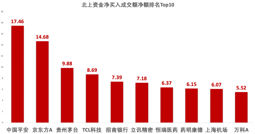 北上资金净买入成交净额排名Top10中,中国平安成为资金大买的对象,买入额达到17.46亿元。此外,京东方A、贵州茅台、TCL科技均获得北水资金青睐。