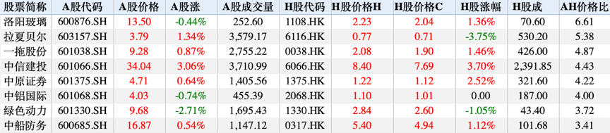 个股方面,洛阳玻璃AH股溢价仍然排名第一。此外,一拖股份、拉夏贝尔、中信建投、中原证券等个股亦存在较大较差,投资者需警惕相关个股风险。
