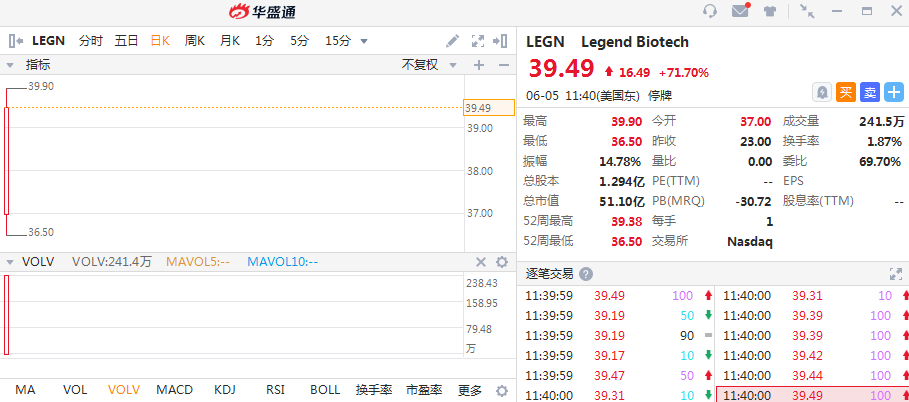 华盛资讯6月5日讯,传奇生物(Legend Biotech)(LEGN.US)首日挂牌暴涨71%,总市值51亿美元。