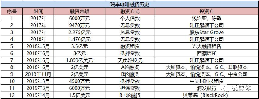 在快速铺店消耗掉巨额资金之时,瑞幸咖啡也以飞快的速度进行着融资。根据《IPO早知道》数据显示,2017年至2019年4月,瑞幸咖啡融资笔数达到12笔,融资总额近10亿美元。