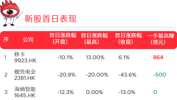 3、本周有3只新股上市,首日1涨2跌,其中移卡最高涨13%,首日账面收益816港元。