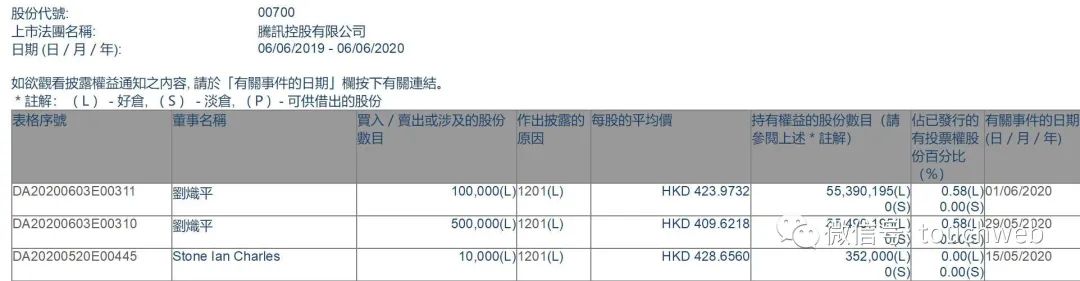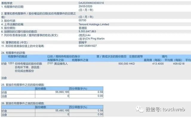 据港交所披露,刘炽平分别在5月29日及6月1日减持腾讯股票,两个交易日共计减持60万股,套现约2.472亿港元。