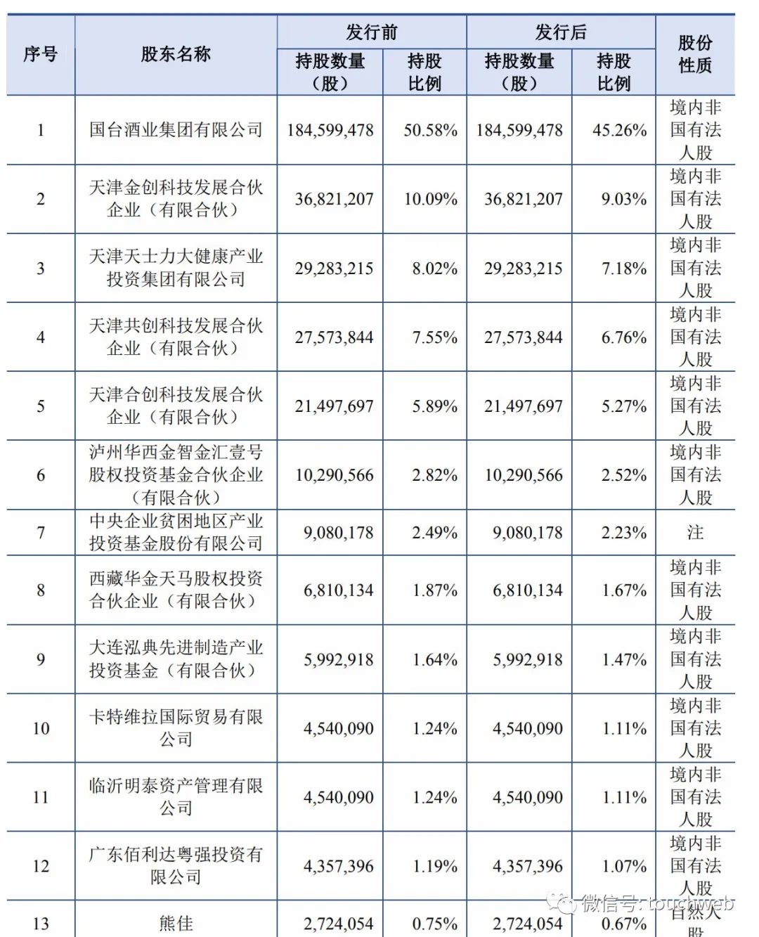 IPO前,国台集团直接持有国台酒业50.58%的股份,同时通过金创合伙、共创合伙和合创合伙间接控制国台酒业23.53%的股份,为公司控股股东。