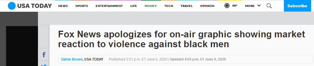 【环球网报道 记者 张晓雅】因节目中一张图,美国福克斯新闻道歉了。综合多家美媒6日消息,当天,福克斯新闻为前一天在节目中呈现“一系列黑人被杀事件发生后股票市场(积极)反应”的图表道歉。