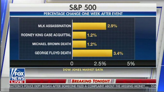 福克斯新闻5日的一场直播节目中放出的图表,分别呈现了1968年民权运动领袖马丁·路德·金被暗杀、2014年非裔青年迈克尔·布朗在没有携带武器的情况下被警方击毙、以及今年5月25日非裔男子乔治·弗洛伊德被白人警察“锁喉致死”一周后,股市的积极变化——标普500指数(S&P 500 index)不同程度上涨。此外,图表还包括了1991年洛杉矶警察殴打酒驾的黑人罗德尼·金却被无罪释放后的市场变化。