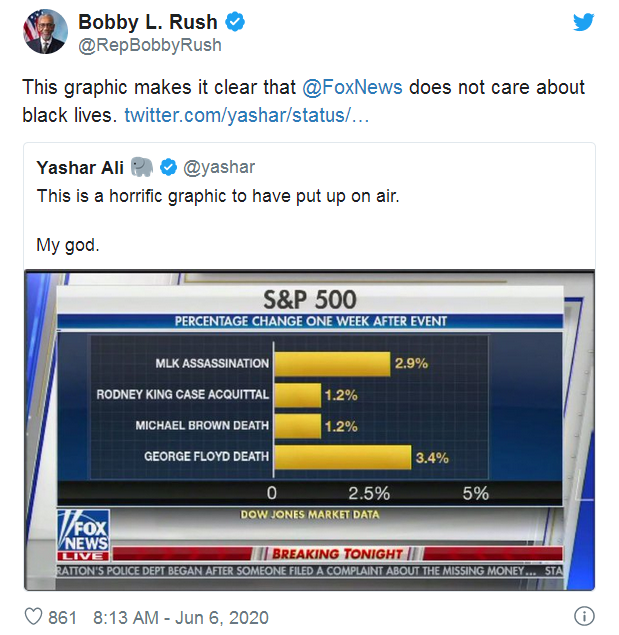 来自伊利诺伊州的民主党众议员鲍比·拉什批评说,“这张图表清楚地表明,福克斯新闻并不关心黑人的生命。”