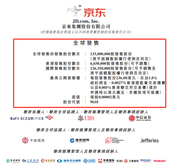 此次京东将发行1.33亿股发售股份,股份代码9618,香港公开发售(初步于香港提呈6,650,000股发售股份(可予重新分配),占全球发售初步提呈的发售股份总数5%);国际发售(初步提呈126,350,000股发售股份(可予重新分配及视乎超额配股权行使与否而定,占全球发售初步提呈的发售股份总数95%)。