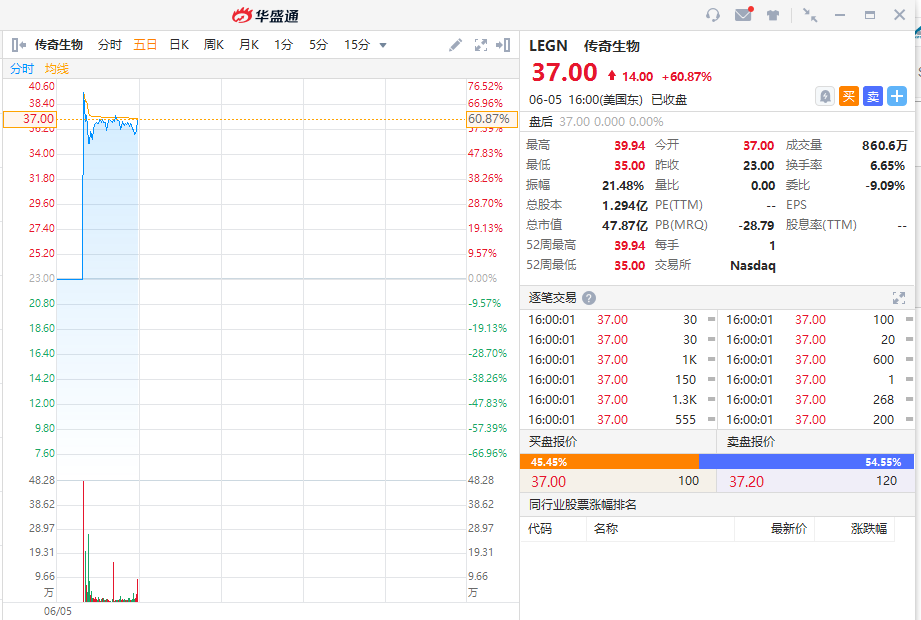 金斯瑞生物子公司传奇生物作为"中国CAR-T第一股"于美国时间2020年6月5日在纳斯达克挂牌交易,股票代号为"LEGN"。首次公开发行定价为每ADS(两股普通股)23美元,总募资金额为4.238亿美元。首个交易日传奇生物大涨60.87%,收盘价为37美元。