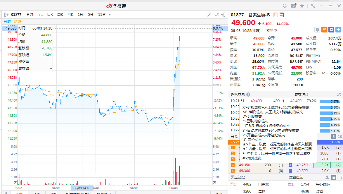 新浪港股讯 6月8日消息,君实生物开展新冠病毒中和抗体临床试验,股价拉升大涨14%,报49.6港元。