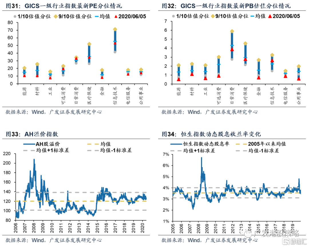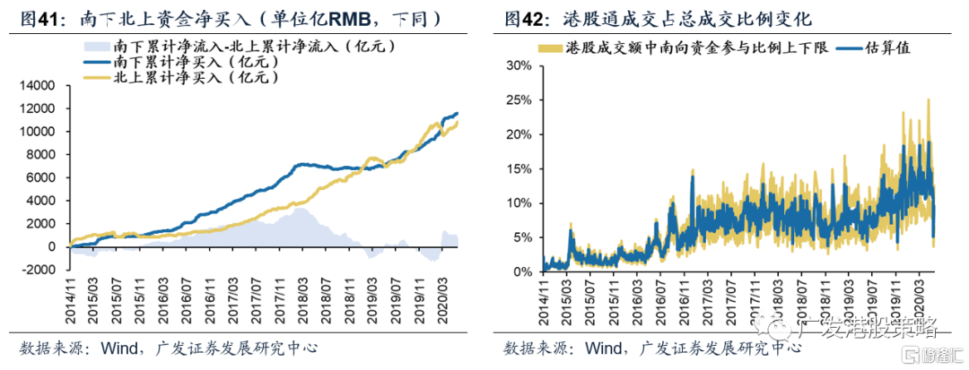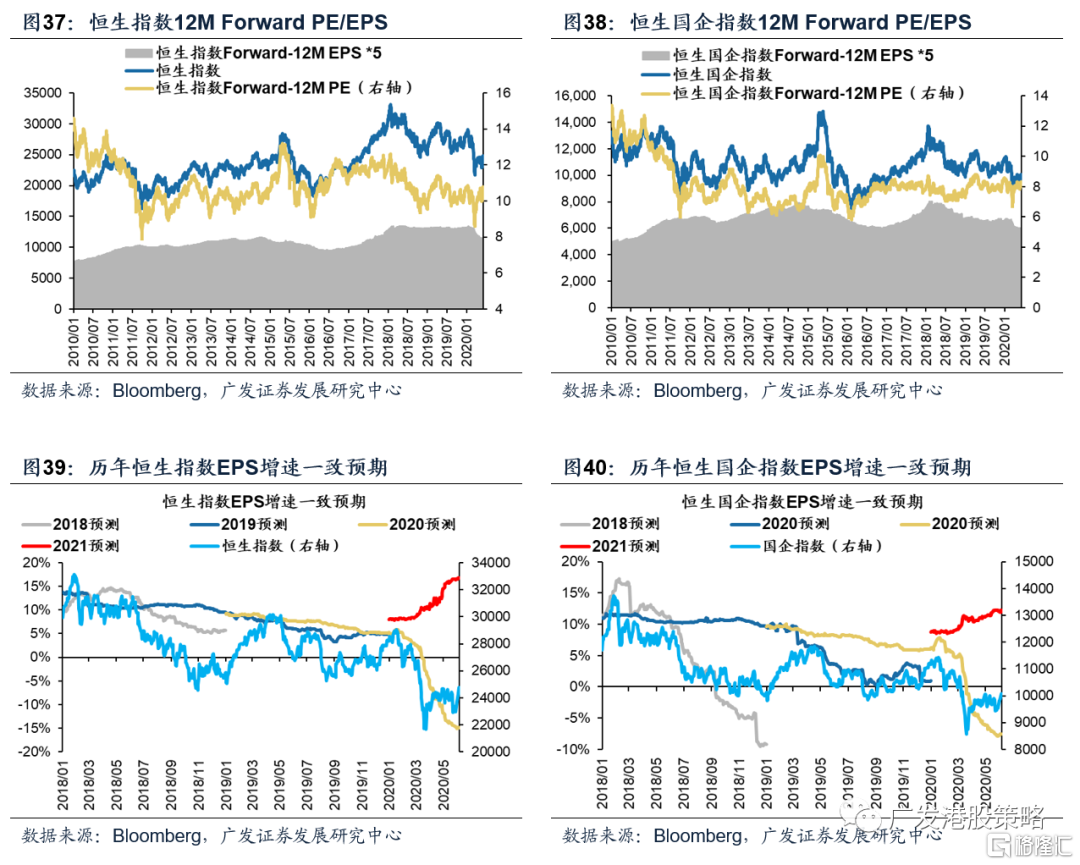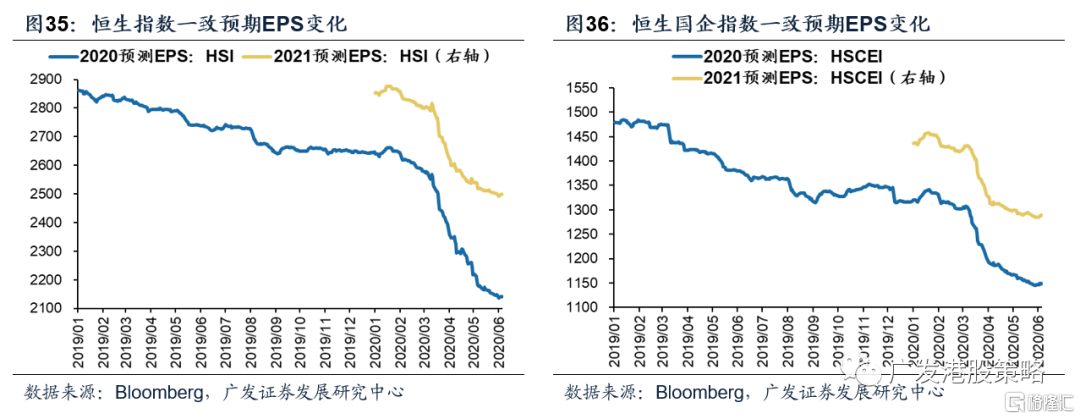 人民币汇率企稳反弹更重要的利好在于稳定市场对港股的盈利预期。自疫情爆发以来,以周度为观察区间,市场对于恒生指数、国企指数20年一致预期EPS持续下修。但本周这一趋势出现逆转,市场对于恒指20年一致预期盈利小幅下调,对于国企指数20年一直预期盈利出现上修。从成份股盈利预期的变化上看,50只恒指成份股中,本周获得市场上修/下修盈利预期的公司分别为15/14家,而全部由中资股组成的恒生国企指数中,本周获得市场上修/下修盈利预测的公司分别为22/11家。