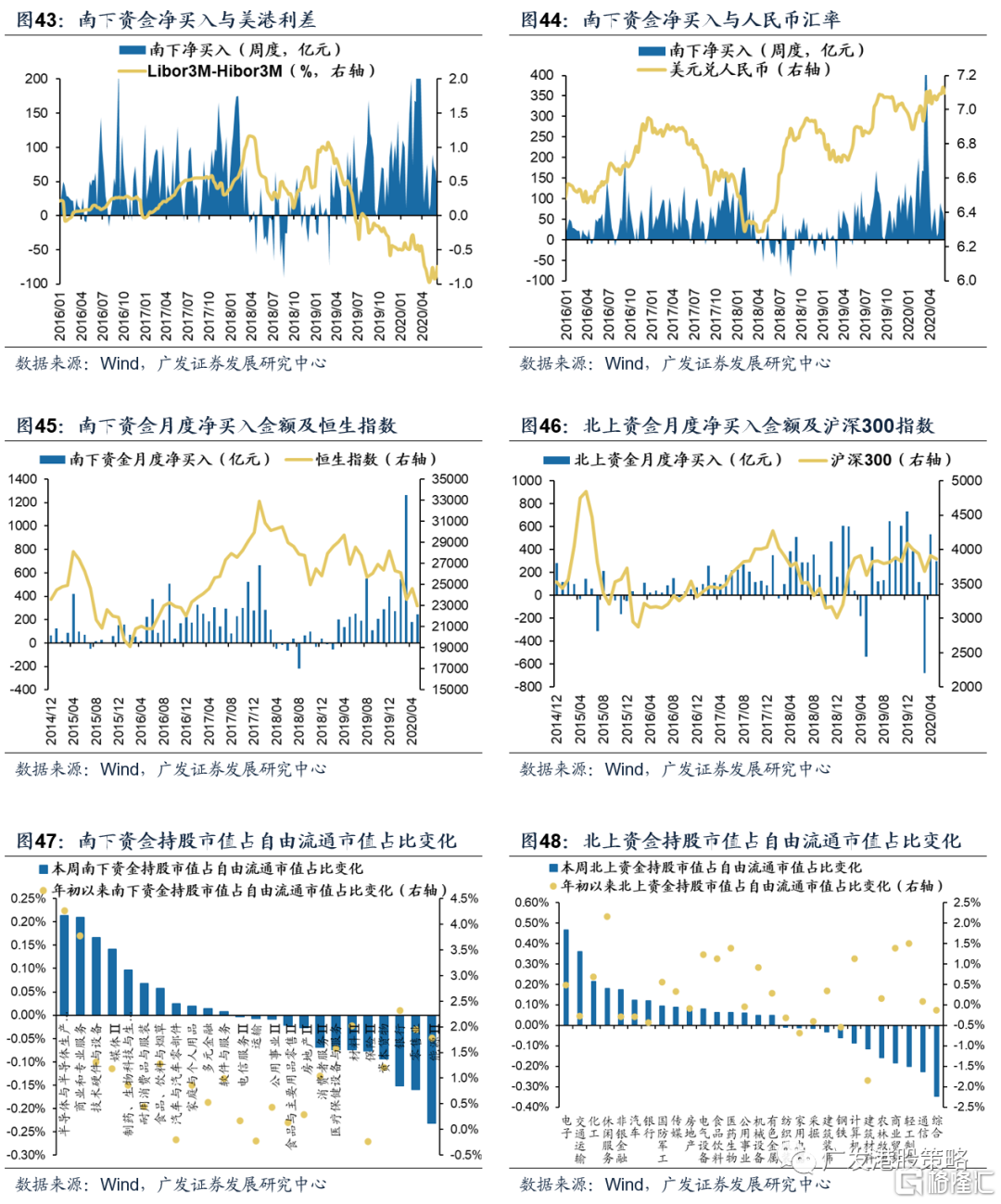 如何解释近期港元、人民币汇率的变化?利差是重要的观测指标。我们在《港元升、人民币贬,对港股有何影响?——港股策论5月第1期,2020-5-3》中指出, Libor-Hibor利差走低对4月港元较强有一定解释力。5月Hibor-Libor利差一度收窄至0.5%,港元汇率小幅走弱,近期港美利差再度走阔,引发套息交易再次活跃。中美利差是影响人民币汇率的基本面因素,5月以来中美利差维持200Bp高位波动,对人民币汇率企稳存在一定支撑。