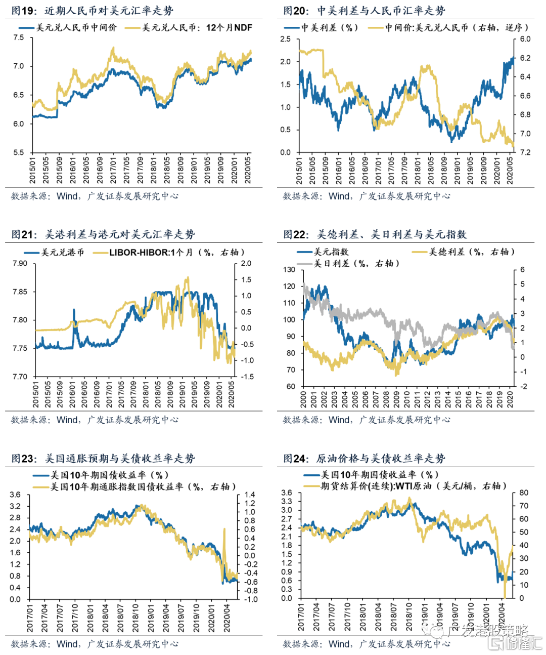 风险事件对汇率短期的走势产生较大影响,本周困扰市场的风险事件均出现相对积极的进展。首先,尽管特朗普表示将取消美国对香港的特殊贸易地位,但未提及取消中美第一阶段贸易协定、对香港金融制裁等话题,市场担忧的对于香港最严厉的制裁情形并没出现。其次,本周美国贸易代表莱特希泽表示对中美第一阶段贸易协议的进展感到满意,中美贸易战短期爆发的风险降低。