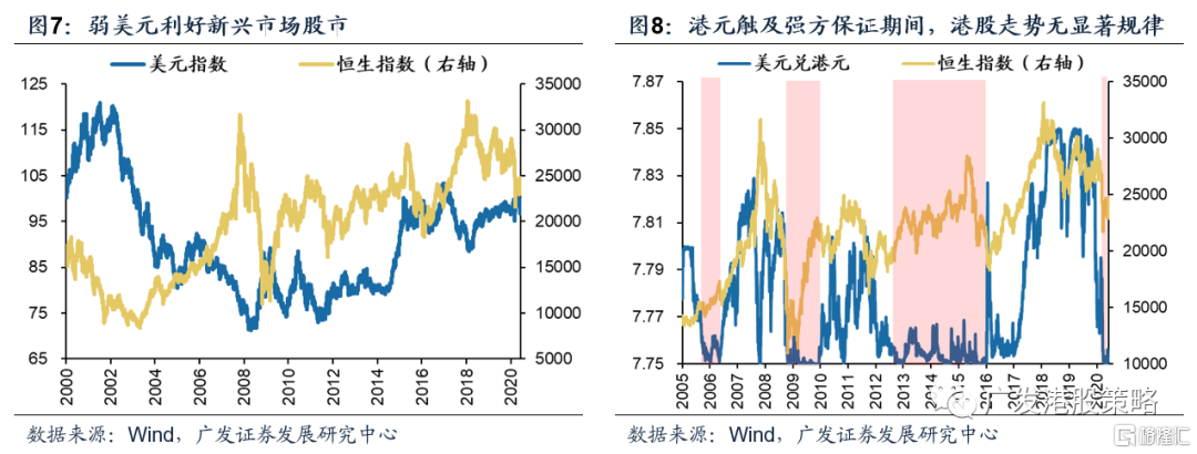 美元走弱推动资金回流港股市场。弱美元环境有利于资金回流新兴市场,考虑今年到美联储扩表释放天量流动性,随着市场风险偏好的改善,过剩资金流出美国并配置新兴市场的意愿或许更强。