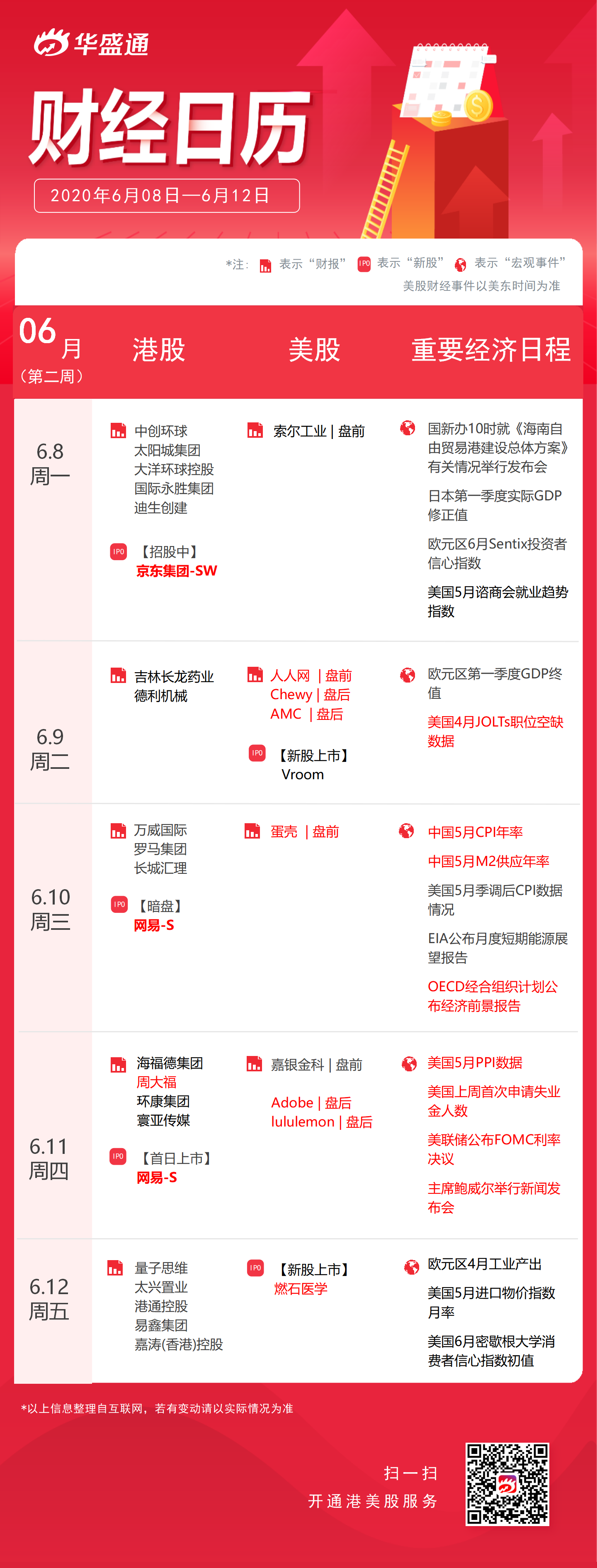 经济数据方面,中国将公布5月通胀指标,社融等金融数据也可能公布。美国将按照惯例公布单周首次申请失业金数据,日本和欧元区第一季度GDP、欧元区投资者信心指数和工业产出等数据也将公布。