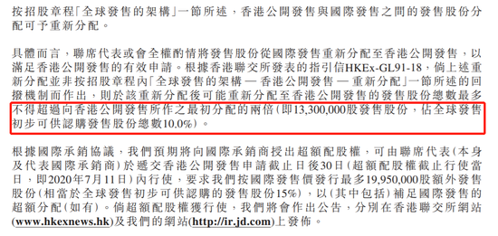 根据招股书,京东公开发售若触发回拨机制,则回拨最高不超过全球发售的10%,即1330万股。