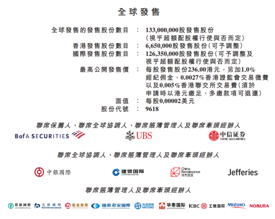 此次京东将发行1.33亿股发售股份,股份代码9618,香港公开发售(初步于香港提呈6,650,000股发售股份(可予重新分配,最高可回拨10%),占全球发售初步提呈的发售股份总数5%);国际发售(初步提呈126,350,000股发售股份(可予重新分配及视乎超额配股权行使与否而定,占全球发售初步提呈的发售股份总数95%)。