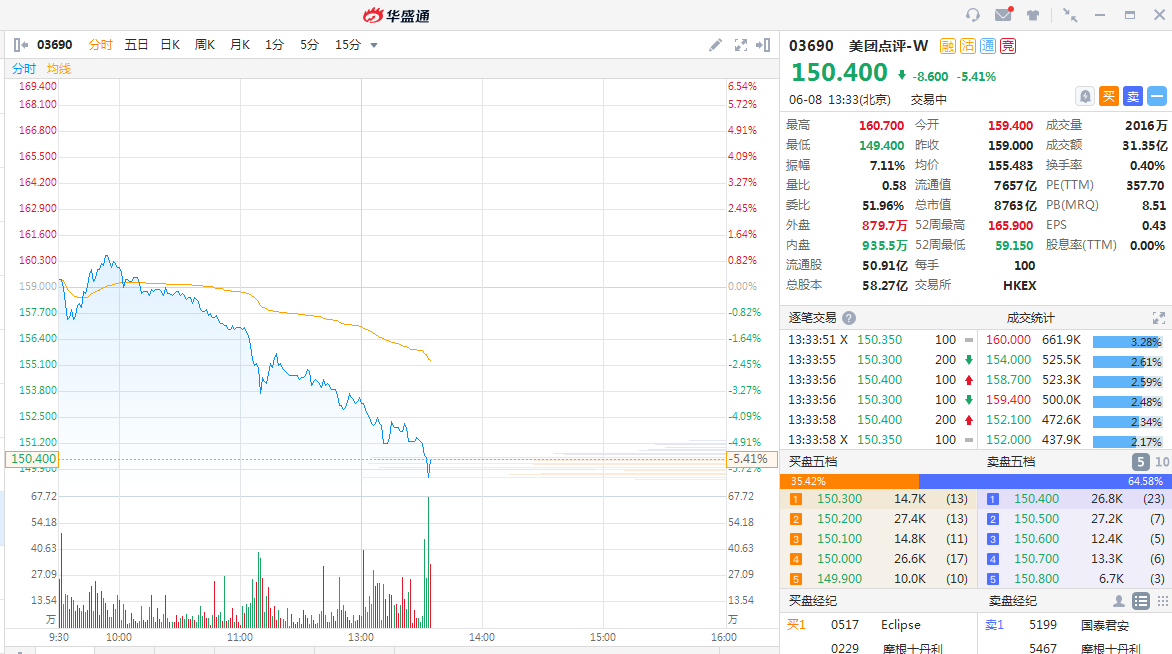 新浪港股讯 6月8日消息,美团午后跌幅扩大至5.41%,报150.4港元,最新市值8763亿港元。上周累涨8.38%,市值一度逼近万亿港元。