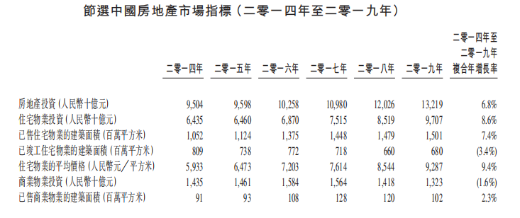 政府自二零一五年以来已采取一系列紧缩政策为过热的住房市场降温,但随着经济及固定资产投资的迅速增加,近年来房地产市场仍实现飞速增长。根据中国国家统计局的资料,房地产投资由二零一四年的人民币95,040亿元增长至二零一九年的人民币132,190亿元,复合年增长率为6.8%。同时,城镇化进程加快及消费升级拉动住宅物业市场的需求。于二零一九年,已登记住宅物业投资为人民币97,070亿元,二零一四年至二零一九年的复合年增长率为8.6%。同期,已售住宅物业的建筑面积以7.4%的复合年增长率增长,而住宅物业的平均价格于二零一九年飙升至每平方米人民币9,287元,复合年增长率为9.4%。