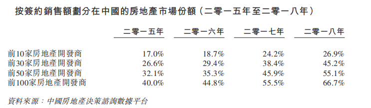中国房地产市场的竞争相对激烈,尤其是住宅物业市场。根据中国国家统计局的资料,截至二零一八年底,中国有97,937家房地产开发商,其中浙江省有6,818家房地产开发商,其中大多数专注于住宅物业开发。随着房地产市场规模的增长及竞争的加剧,大型房地产开发商的规模有可能保持快速增长。根据中国房地产决策咨询数据平台,自二零一五年至二零一八年,就前10、30、50及100家房地产开发商而言,按签约销售额划分的市场份额增长迅速。就前30家开发商而言,市场份额由二零一五年的26.6%增加至二零一八年的45.2%,就前50家开发商而言,二零一八年的市场份额达55.1%,较二零一五年高23.0个百分点。下表载列于所示年度,按签约销售额划分在中国前10、30、50及100家房地产开发商的市场份额: