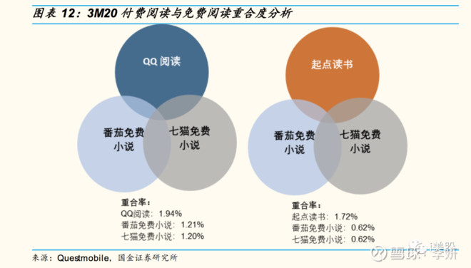 根据Questmobile数据(国金证券研究所绘图,如下),2020 年3 月,以番茄免费小说活跃用户数为基数来看,QQ 阅读、七猫免费小说与番茄免费小说的重合度为1.21%;起点读书、七猫免费小说与番茄免费小说的重合度为0.62%。低重合度说明了免费模式带来的是增量,对存量市场的竞争较小,番茄、七猫、以及米读,通过流量玩法迅速取得的千万级别MAU规模,为阅文的免费战略提供了强有力的参考。