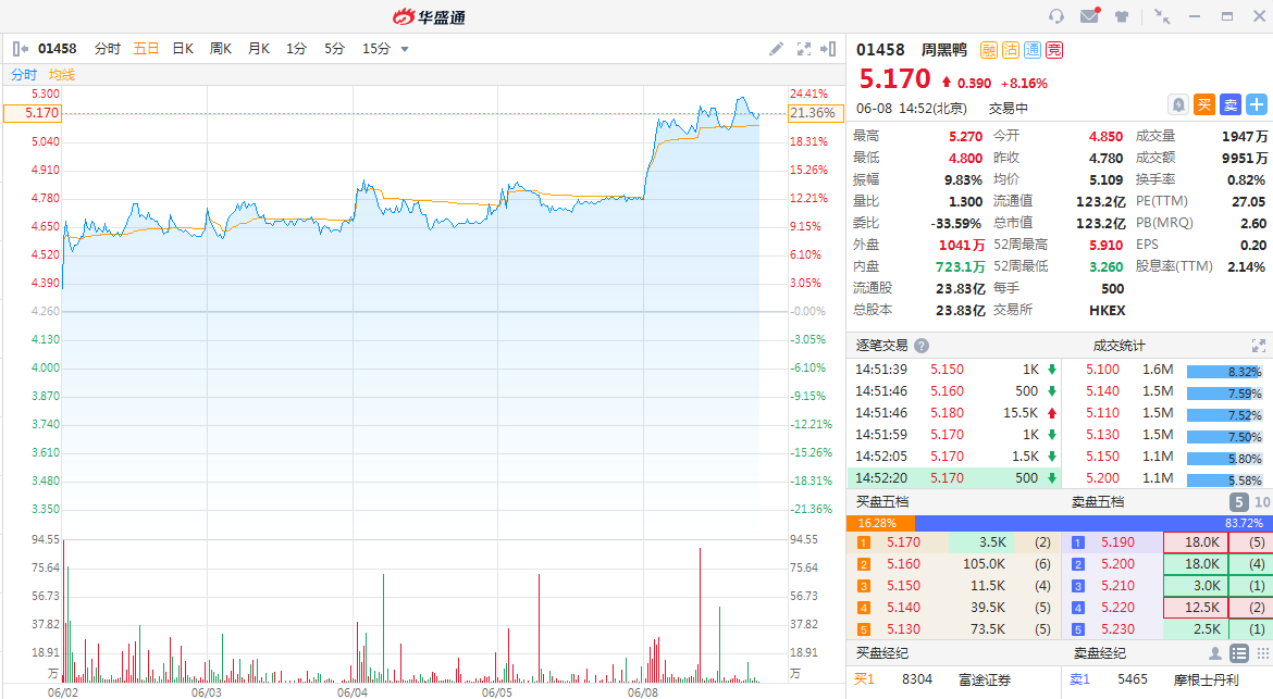 周黑鸭(01458)近期获里昂看高至5.7港元,并重申“买入”评级,该股延续涨势,盘中高见5.27港元,逼近年内新高,截至14时52分,涨8.16%,报价5.17港元,成交额9551万。