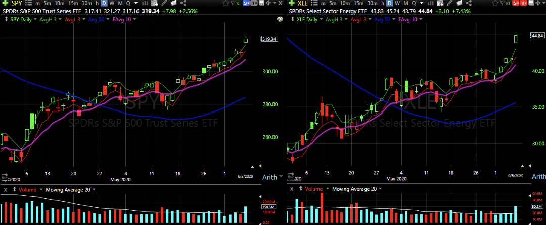 上周五(6/5),5月份非农就业人数不仅没像专家们预期的减少800万,反而增加了250万人,失业率13.3%,也远低于预期,足见经济复苏进程将比预期的来得快。市场在能源、金融和工业等经济敏感型板块的推动下,大幅开高走高,且上涨有量,纳斯达克指数再创历史新高。