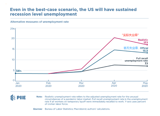 为了使劳动力参与率数据与金融危机时的情况更具可比性,PIIE将一部分声称自己不属于劳动力的人重新归类为失业者,其结果是140多万人将被重新归入失业行列,修正后的劳动参与率上升了0.5个百分点。而综合两个调整后的“实际失业率”则上升到了17.1%,与劳工统计局声明中“5月的失业率可能超过16%,比公布数据高3个百分点”的判断大致相符 (图: PIIE)。