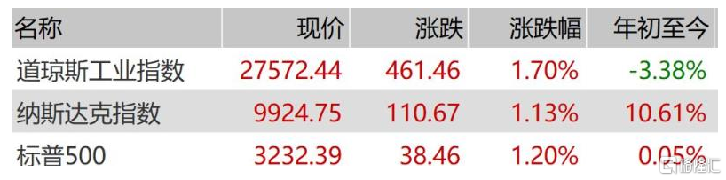 由于对经济复苏步伐越来越乐观,美国股市周一上涨,纳斯达克综合指数创下历史新高9927.13,而标准普尔500指数则收复今年“失地”。道琼斯工业平均指数上涨461.46点或1.7%,至27572.44,而标准普尔500指数上涨38.46点或1.2%,至3232.39,从而使该指数较2019年收盘价上涨近0.05%。