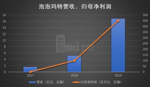 2017年以来的三年间,泡泡玛特实现业绩爆发式增长。营业收入从2017年1.58亿元上升至2019年16.83亿元,两年增长近10倍;同期的归母净利润从1.6百万元上升至451.1百万元,两年增逾280倍。